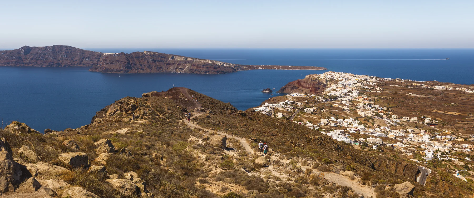 Almost at the North end of Santorini. The town of Oia is on the right, island Thirasia on the left.
